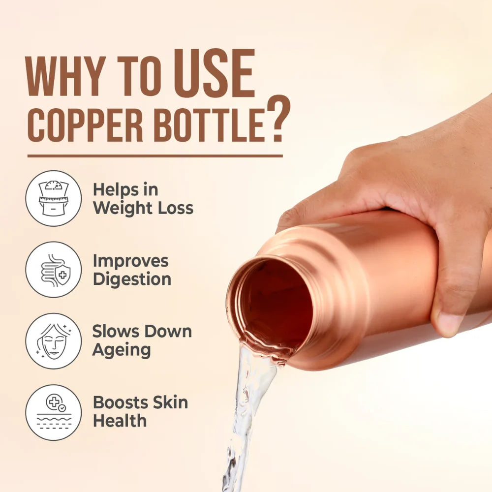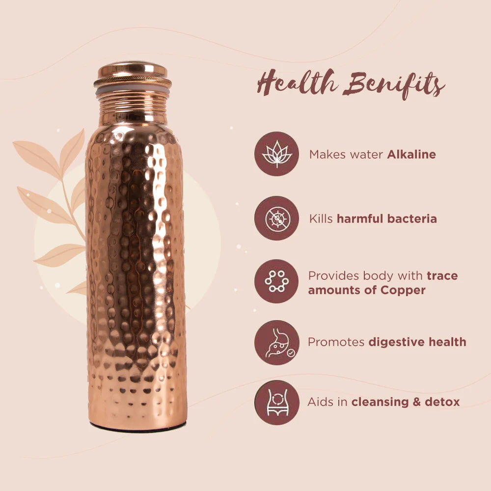 Drinking from a copper water bottle may enhance cardiovascular health, support thyroid gland function, and balance the three doshas in Ayurveda: Vata, Pitta, and Kapha, promoting overall wellness. Copper’s natural antibacterial properties can help prevent waterborne illnesses, while also aiding digestion, strengthening immunity by supporting white blood cells, and assisting the body’s natural detox process.